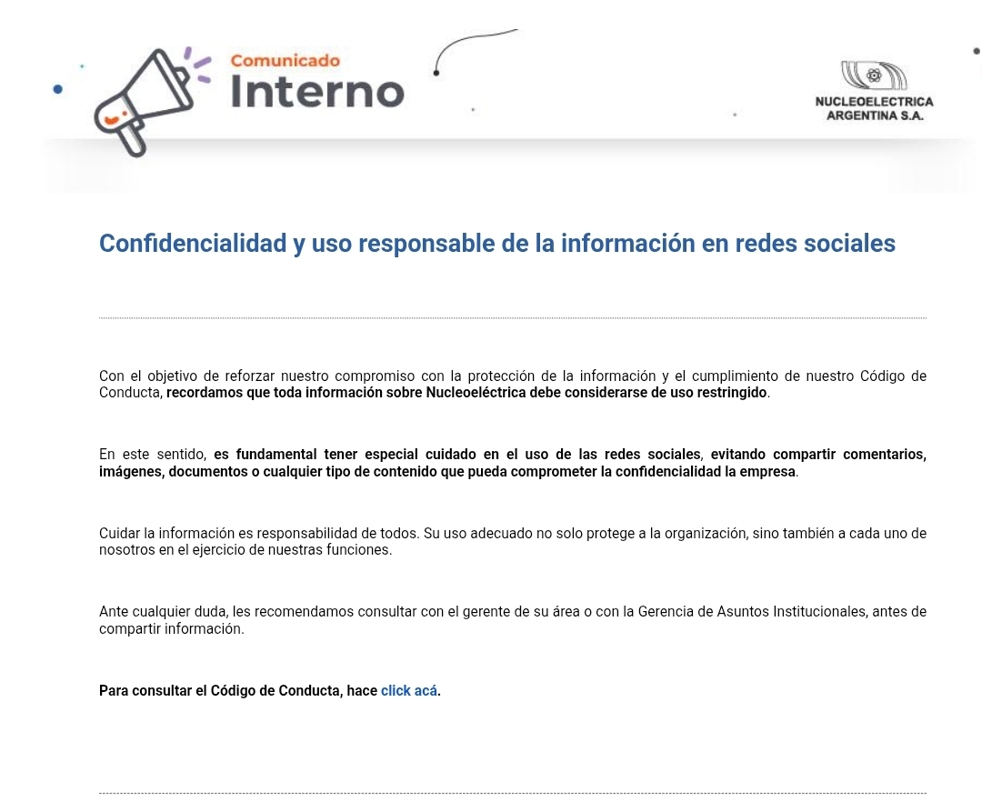 Un “Código” unilateral que sólo conoce quien escribe el mail, que apunta más a evitar la difusión de desmanejos, negociados y acciones que afectan el interés nacional en la empresa, que a cuidar los recursos estratégicos que, compartiríamos, son indispensables para la seguridad de una central nuclear.